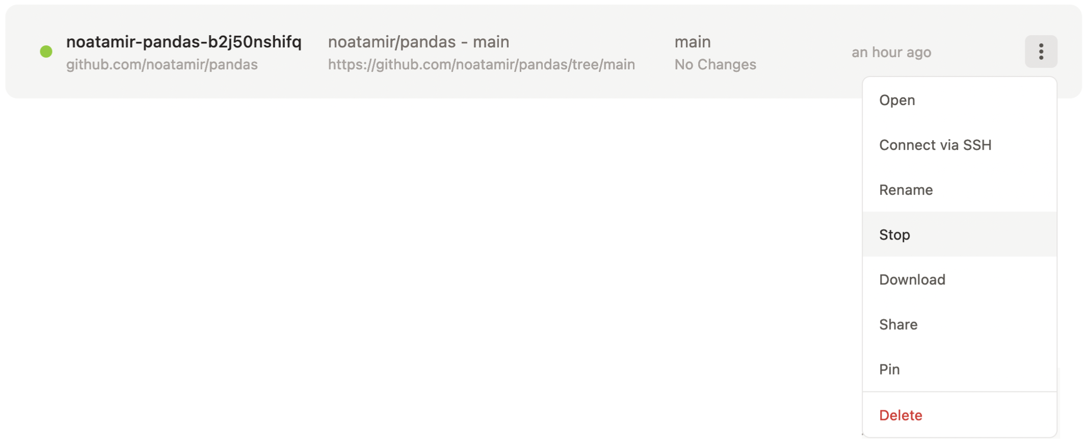 Yes, let’s say you stepped away for a while and you want to carry on working on your pandas contributions. You need to visit https://gitpod.io/workspaces and click on the workspace you want to spin up again. All your changes will be there as you last left them.